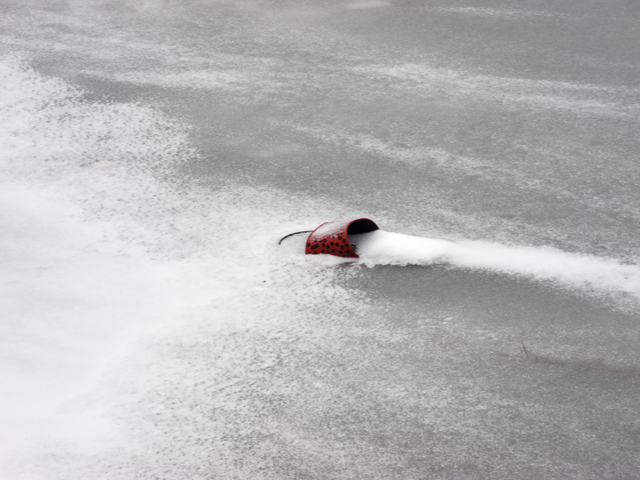 Im Schäfersee steckt eine rote Plastiksandale im Eis fest. (wt)
